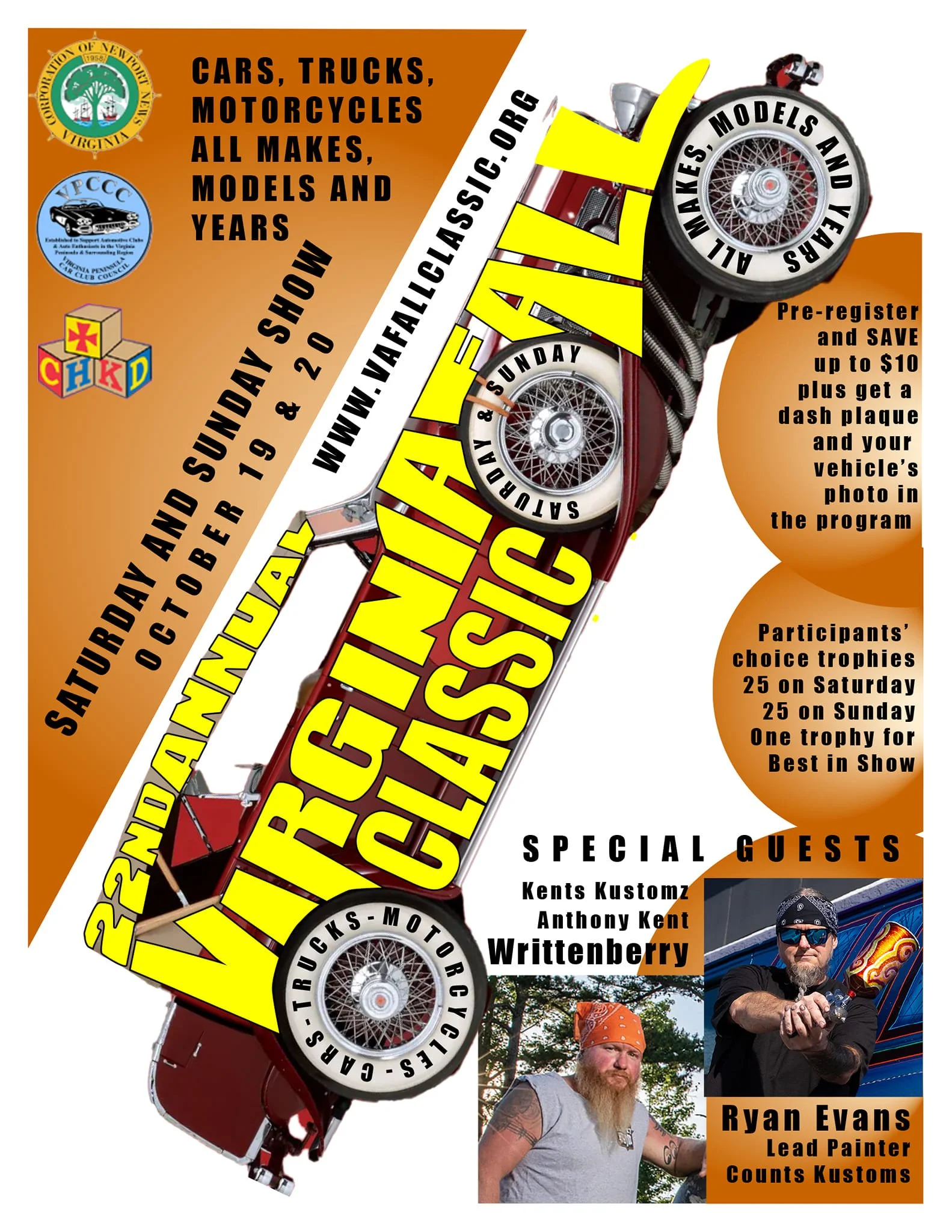 This is a two day show! This year's special guests are Ryan Evans from Counts Kustoms and Kent Writtenberry from Kents Kustoms. The show is open to all cars, trucks, and motorcycles, all year's, all models. Bring your ride to the best show in Hampton Roads!