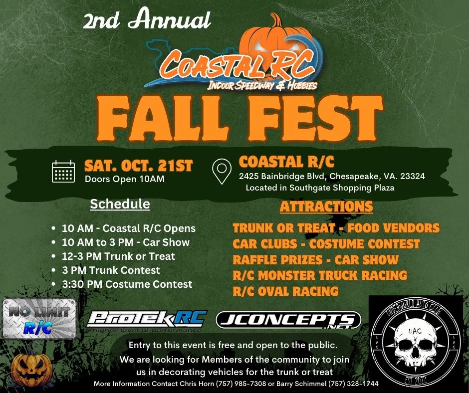2nd Annual Coastal R/C Fall Fest, Fun for all. Food Vendors on Site, Trunk or Treat, Car Show, , R/C Monster Truck Racing presented by No Limit RC of Virginia, More to be announced!