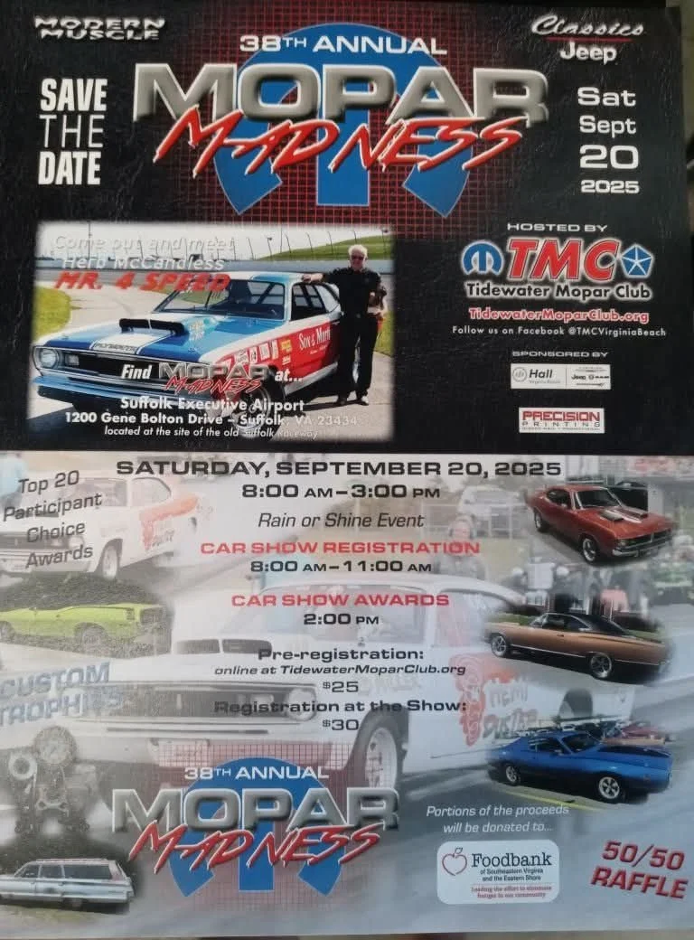 Located at Suffolk Executive Airport, 1200 Gene Bolton Dr., Suffolk. All Mopar Show! Modern Muscle, Classics, Jeeps. Celebrity Appearance by Herb McCandless 'Mr 4 Speed'! FUN for ALL! Photo Sessions, Door Prizes, Raffles - 50/50 & Awesome Swag, Food- Breakfast & BBQ! Pre-Registration online at TidewaterMoparClub.org $25. Registration at show $30. Custom Hand Built Trophies. Portion of proceeds go to Foodbank of Southeastern Virginia and Eastern Shore. Rain or Shine.