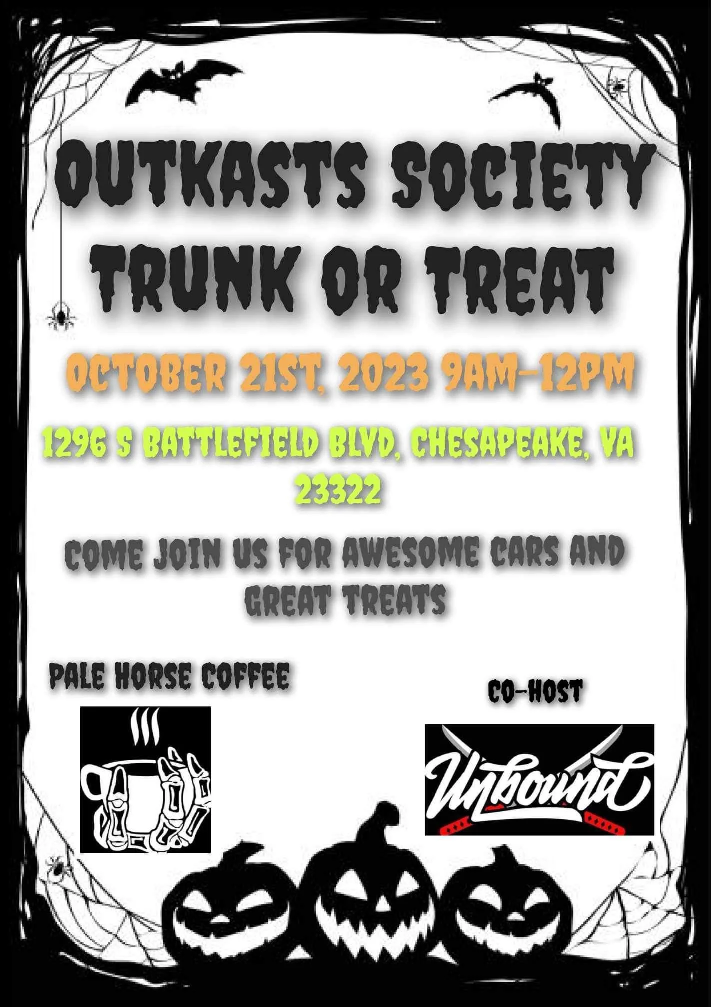 Join Outkasts Society with cohost Unbound at Pale Horse Coffee in Great Bridge for Trunk or Treat. There will be a few baskets to be raffled off with some goodies in them and a portion of the proceeds from the raffles will be donated to the Mayflower Marathon Food Drive. Also if you would like to donate any food or personal hygiene products to the Mayflower Marathon Food Drive we will also be taking those donations. Here is the link of the most needed items for the food drive. Thank you for your support we hope to see you there!