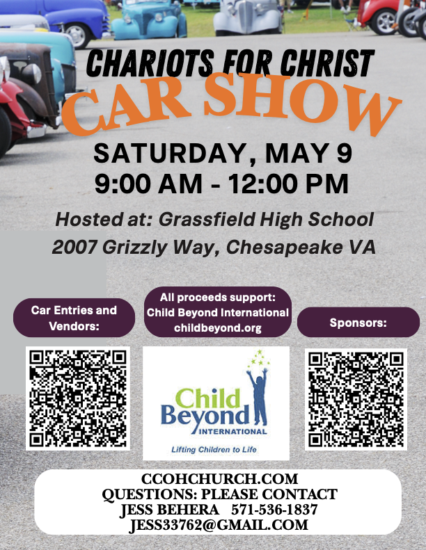Chariots For Christ Car Show | May 9th Saturday, May 9, 2026 9:00 AM 12:00 PM 09:00 12:00 Located at 2007 Grizzly Way, Chesapeake VA (map) Google Calendar ICS Chariots For Christ Car Show hosted by Grassfield High SchoolSaturday, May 9th | 9a-NoonLocated at 2007 Grizzly Way, Chesapeake VA
