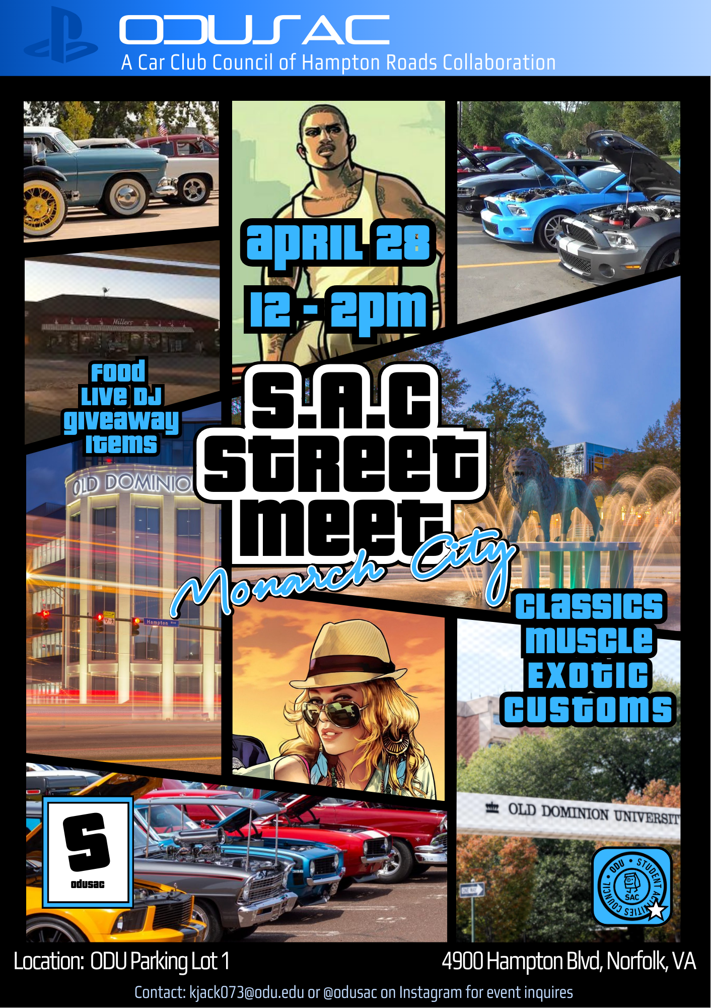 ODUSAC S.A.C Street Meet | April 28th Tuesday, April 28, 2026 12:00 PM 2:00 PM 12:00 14:00 ODU Parking Lot 1 4800 Hampton Boulevard Norfolk, VA, 23508 United States (map) Google Calendar ICS ODUSAC S.A.C Street MeetWednesday, April 28th | 12-2pLocated at ODU Parking Lot 1 | 4900 Hampton Blvd. Norfolk VARegister with QR Code below!